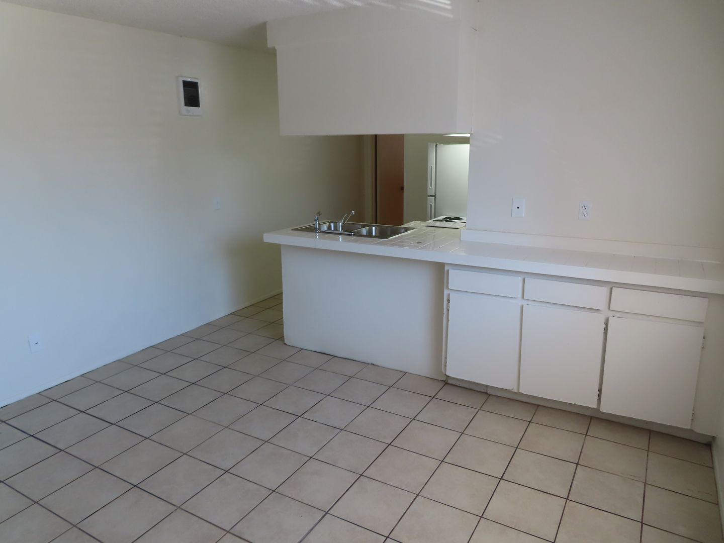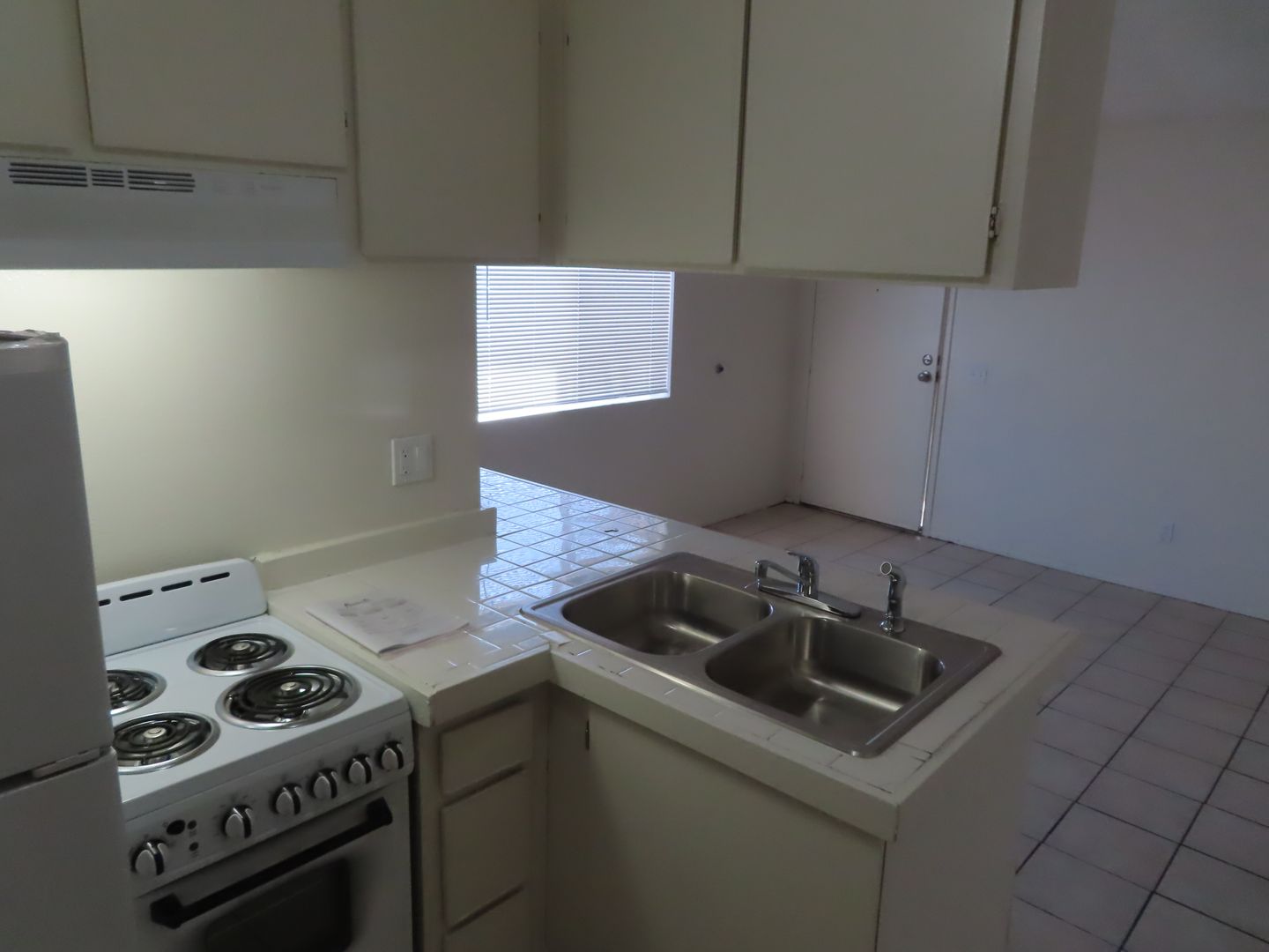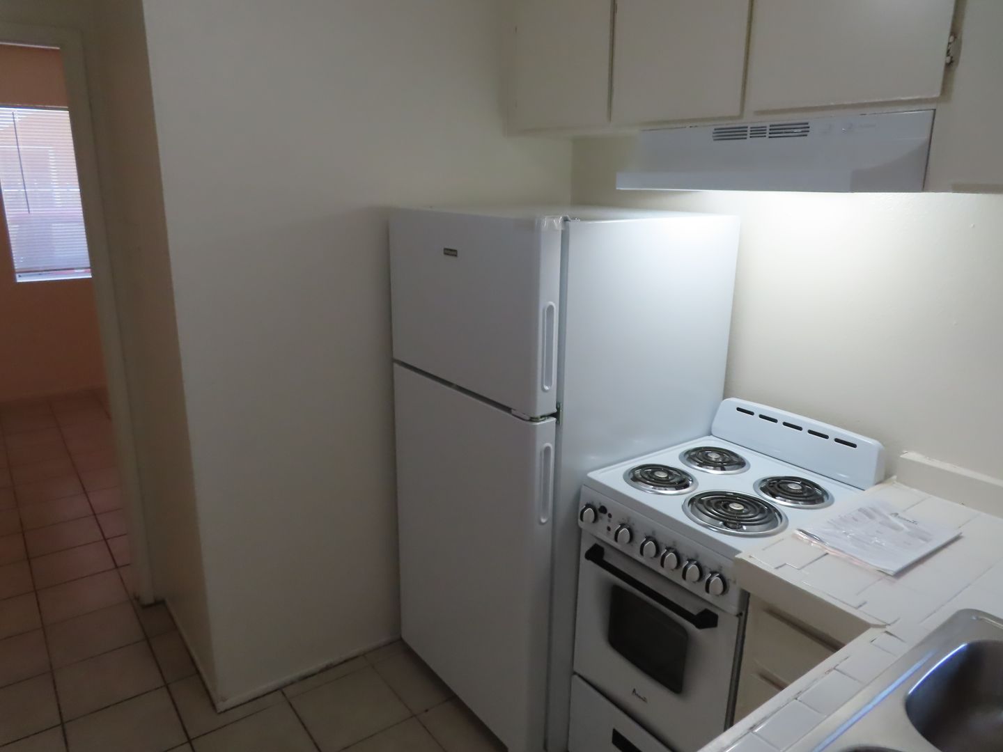 Downstairs apartment with fresh paint. Tile floors throughout are easy to keep clean. Kitchen appliances include a stove and fridge.
