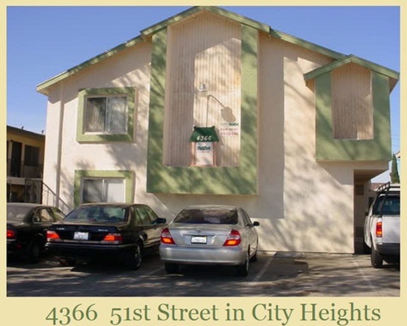 The apartment building is centrally located in City Heights and close to shopping, restaurants, public transportation and other major routes. Conveniently located, it is not far from the City Heights Urban Village, which is a joint public and private City of San Diego redevelopment project which boasts the Mid-City Police Substation and Community Gymnasium, the Weingart City Heights Branch Library and the new YMCA!