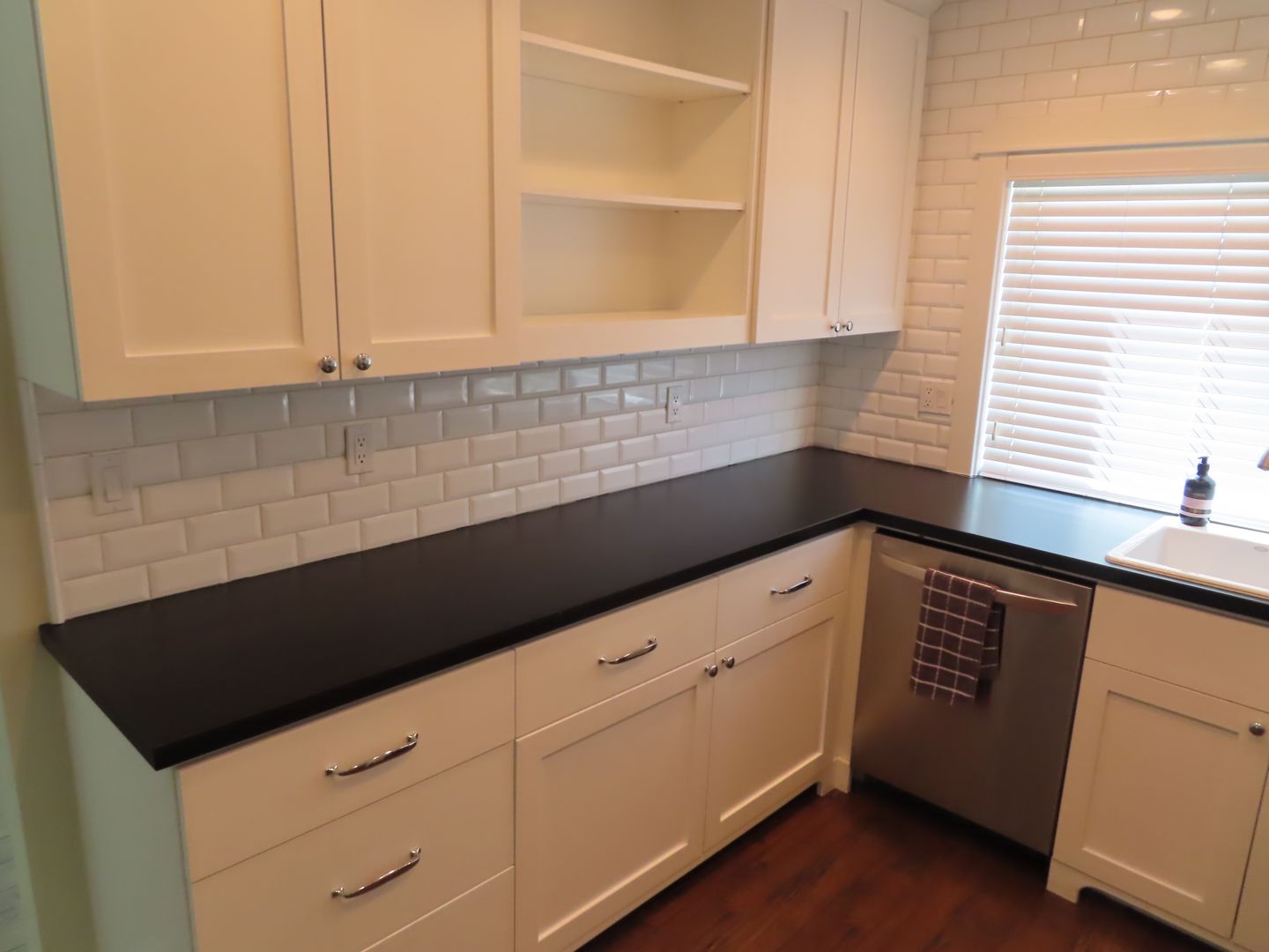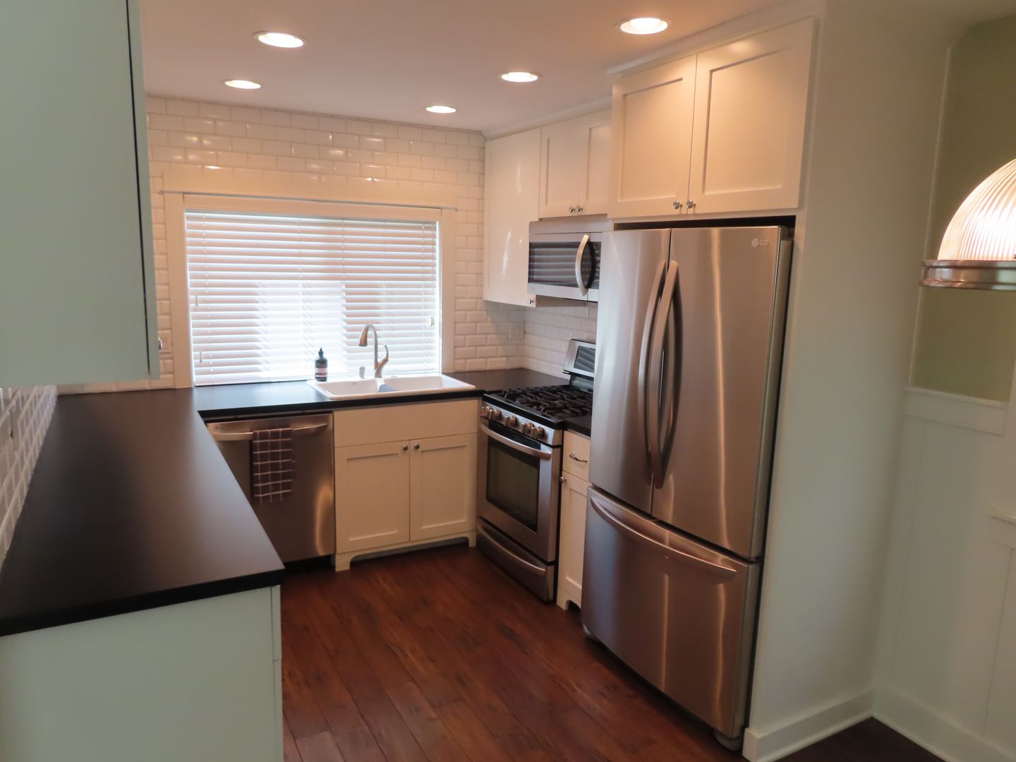 * Renovated kitchen with white shaker cabinets, dark quartz tops, all stainless appliances, and recessed lighting
