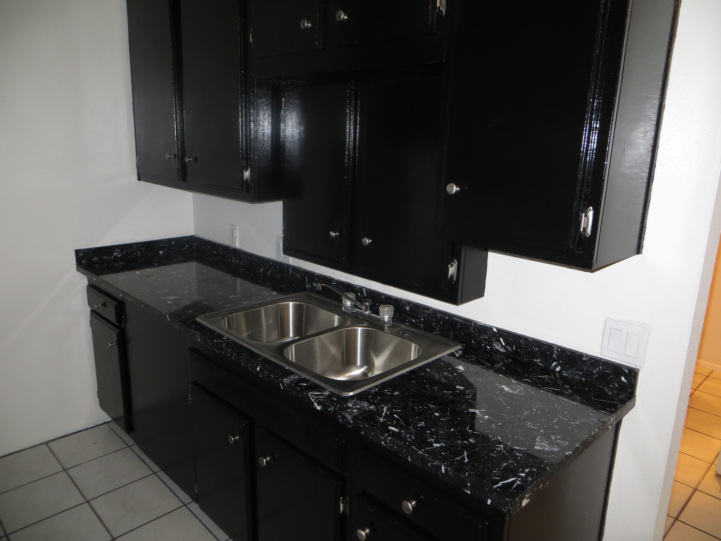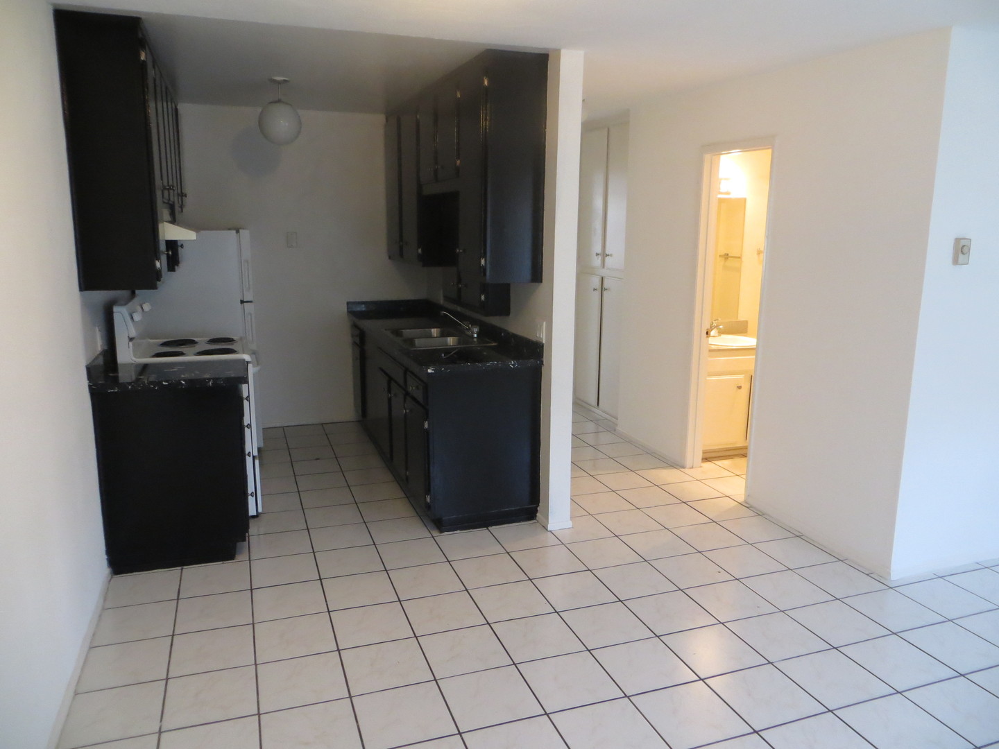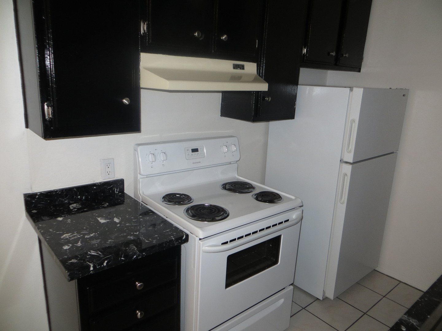 Upstairs, one bedroom Apartment inside a gated building. With its casual space, white walls and tile flooring, it has a very open and fresh feel to it. The kitchen has been updated with many upgrades. You will love the black marble countertops that match the sleek black cabinetry, pairs nicely with the white refrigerator and stove.